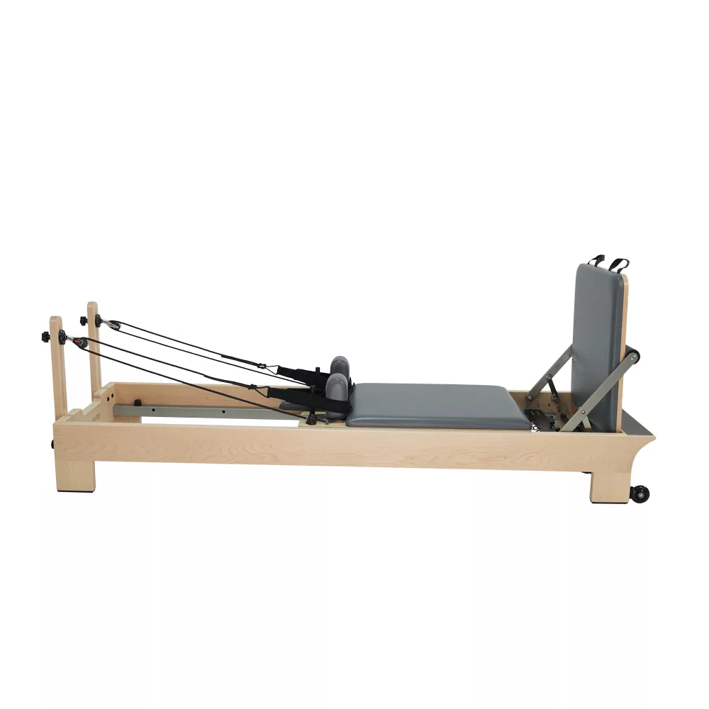 The reformer features a bold, structured silhouette with balanced proportions, matte wood grain, and metallic accents—bringing refined visual impact to any studio.